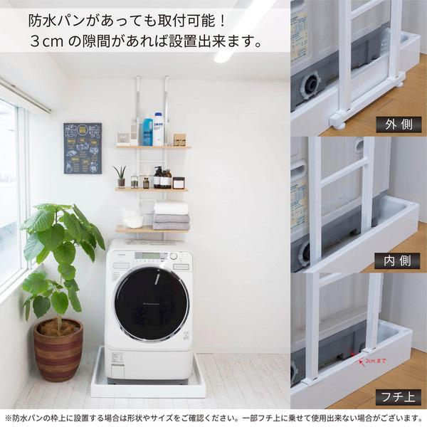 3cmの隙間があれば防水パンの内側や縁にも設置可の洗濯機収納スチール 突っ張り つっぱり式 洗濯機ラック ランドリー収納 洗濯機収納 ランドリーラック 防水パン 洗濯パン