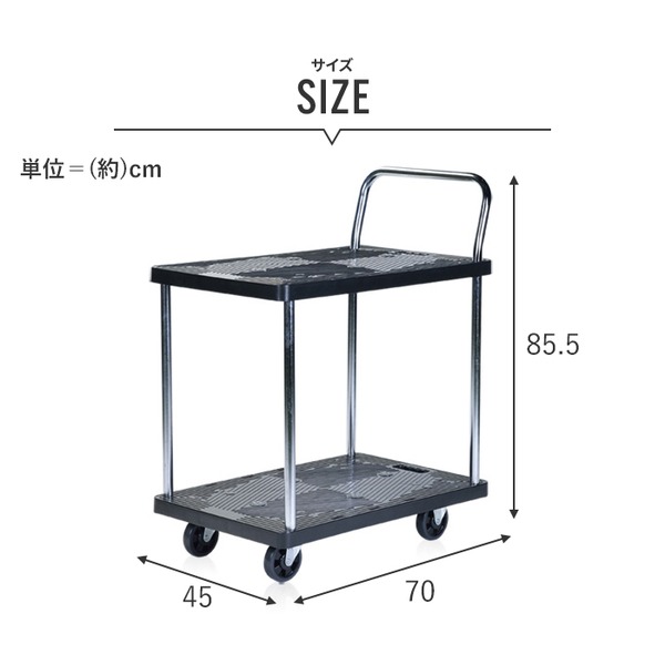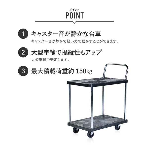 商品仕様: 台車 最大積載荷重150kg 幅450mm 2段 静音設計 樹脂 運搬 移動 配達 宅配便 集配 集荷 出荷 荷下ろし 物流業務 お客様組立品