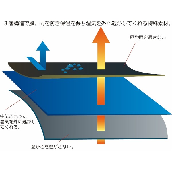 インナーにはフリース素材を使用し保温性にも優れたこのジャケットは表面に3層ポリエステルを使用していて雨や風をブロックしながら通気性にも優れ、また温かさを維持してくれる優れモノです。