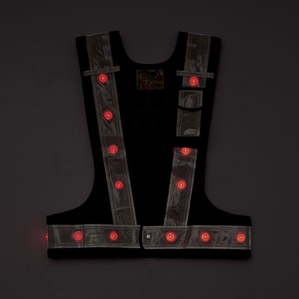 革新的な機能を備えた究極のLEDベスト 紺のメッシュと白の反射部で安全 安心 性を高め、赤いLEDの輝きが目を引く 革新的な機能を備えた究極のLEDベスト 紺のメッシュと白の反射部で安全 安心 性を高め、赤いLEDの輝きが目を引く