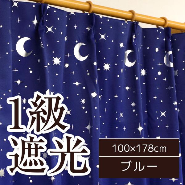 1級遮光 遮光カーテン 2枚組 100×178cm ブルー 月 星 夜空 形状記憶 遮光 ステラ 九装 青 送料無料