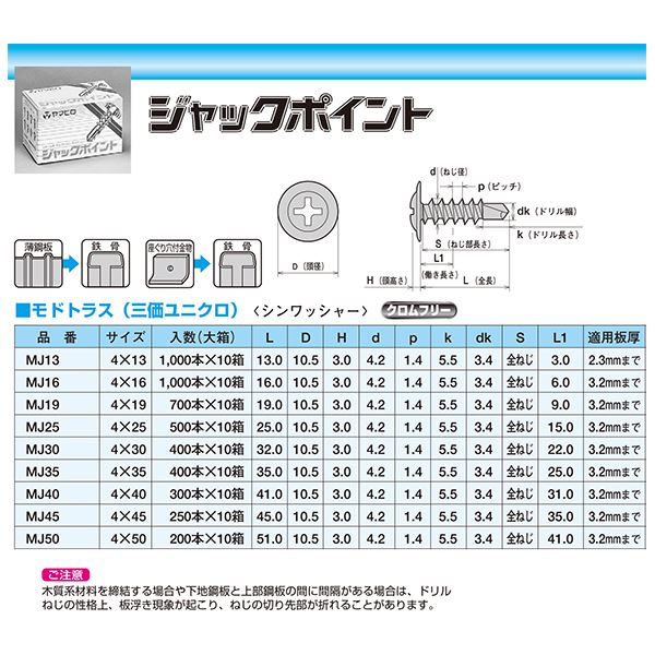 穴なしで簡単取り付け 頼れる金属 スチール ねじ、穴あけ不要の鋼板取り付け専用ジャックポイント ドリルビスMJ13、1000本入り 【0010-00722】 ジャックポイント(ドリルビス) MJ13 [1000本入]【0010-00722】