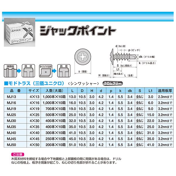 穴なしで簡単取り付け 頼れる金属 スチール の螺子、穴あけ不要の鋼板取り付け専用ジャックポイント ドリルビスMJ30、400本入り 【0010-00725】 ジャックポイント(ドリルビス) MJ30 [400本入]【0010-00725】