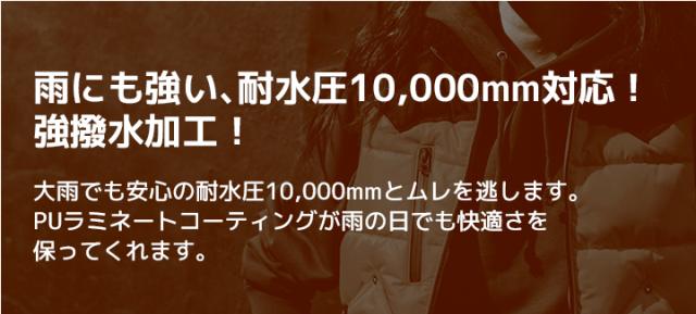 耐水圧10,000mm(PUラミネートコーティング)、強撥水加工