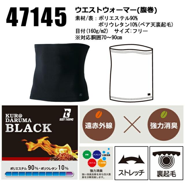 防寒 ウエストウォーマー 腹巻き 天然珈琲炭 保温 インナー 裏起毛 ストレッチ 消臭 遠赤外線 47145 クロダルマ 防寒 秋冬 ライフウェア アウトドア 自転車 バイク 配達 通勤 通学 作業服 作業着