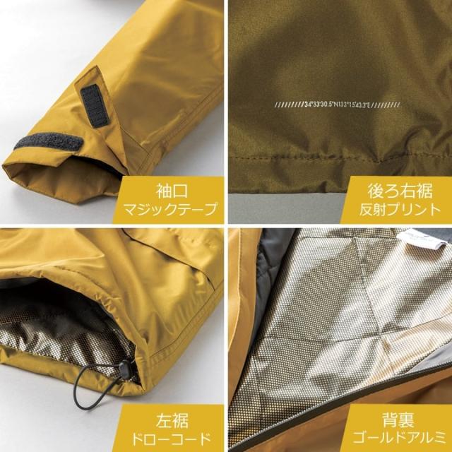 高品質レインウェアクラスの防水透湿性を誇り裏アルミによる保温性の高い防寒アイテム。