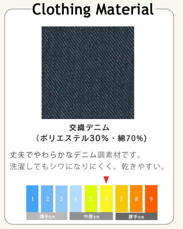 | 素材 | 交織デニム(綿70%、ポリエステル30%) |