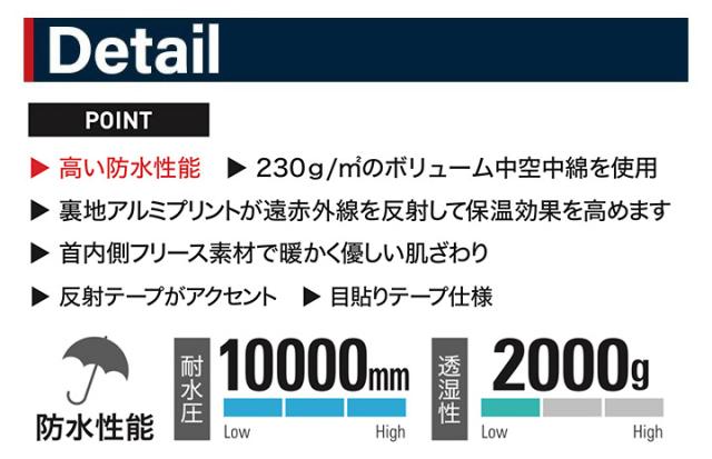 裏アルミとボリューム中綿使用。高い保温性の防水防寒。