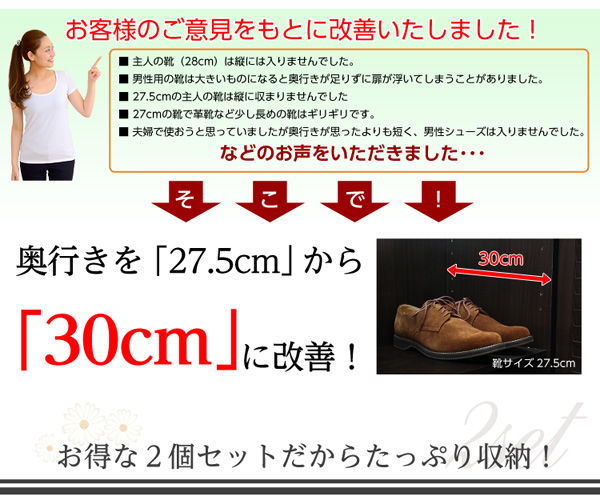- 28センチの靴も真っ直ぐ入れられる事を条件に探してました。 内部が27までの物が多い中、入れられるやつがあって良かったです。