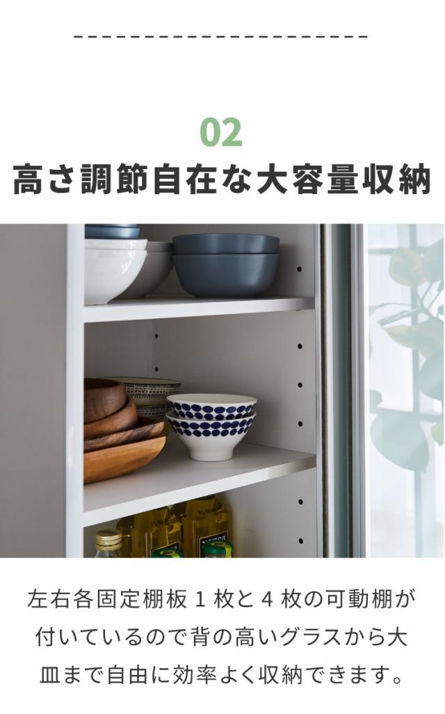 左右共通の収納スペースには、一枚の固定棚板のほか4枚の可動棚が付属。自由に高さ調節が可能なので、背の高いグラスから平皿まで、効率よく抜群の収納力を発揮します。
