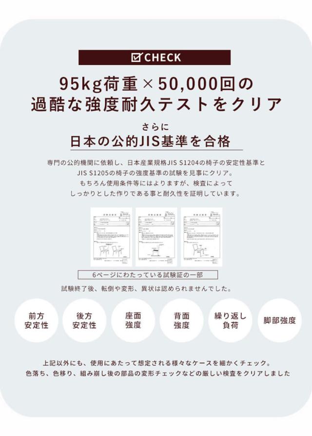 95kg荷重×5万回の過酷な強度耐久テストをクリア。安心してお使い頂くために様々な条件下で耐久試験を実施しました。