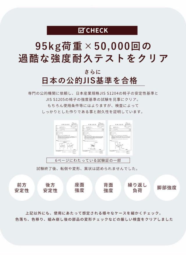 95kg荷重×5万回の過酷な強度耐久テストをクリア。安心してお使い頂くために様々な条件下で耐久試験を実施しました。