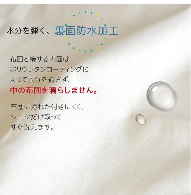 「布団と接する内面はポリウレタンコーティングによって水分を通さず、中の布団を濡らしません。」