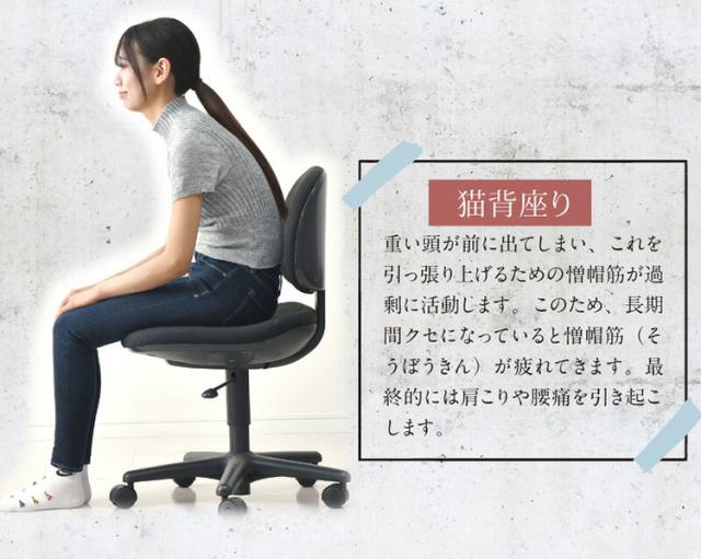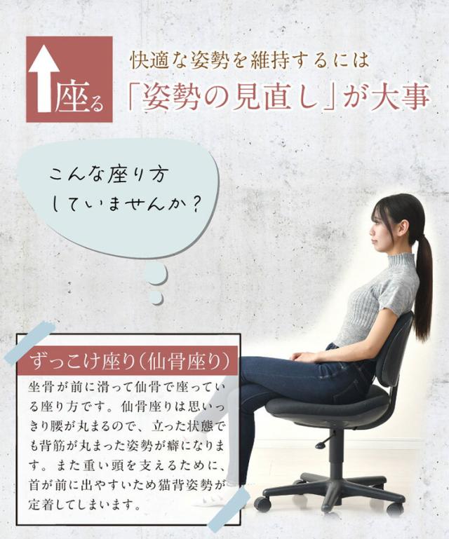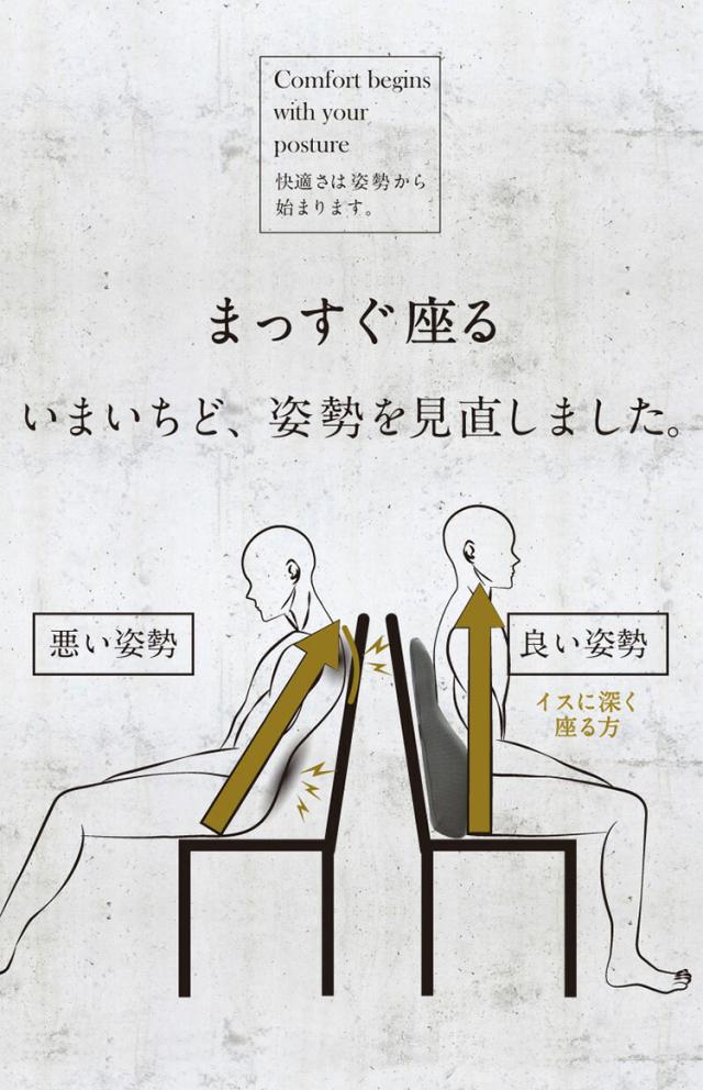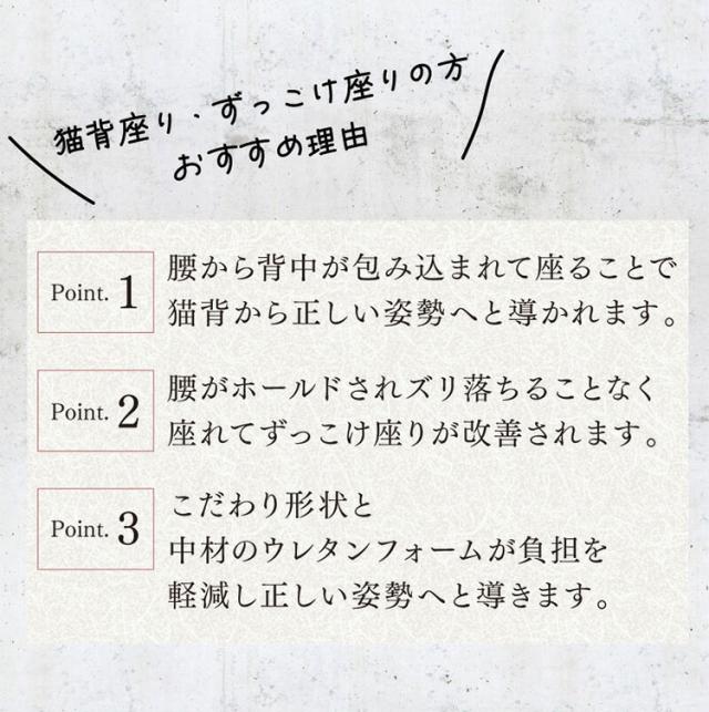 Point.1…腰から背中が包み込まれて座ることで猫背から正しい姿勢へと導かれます。