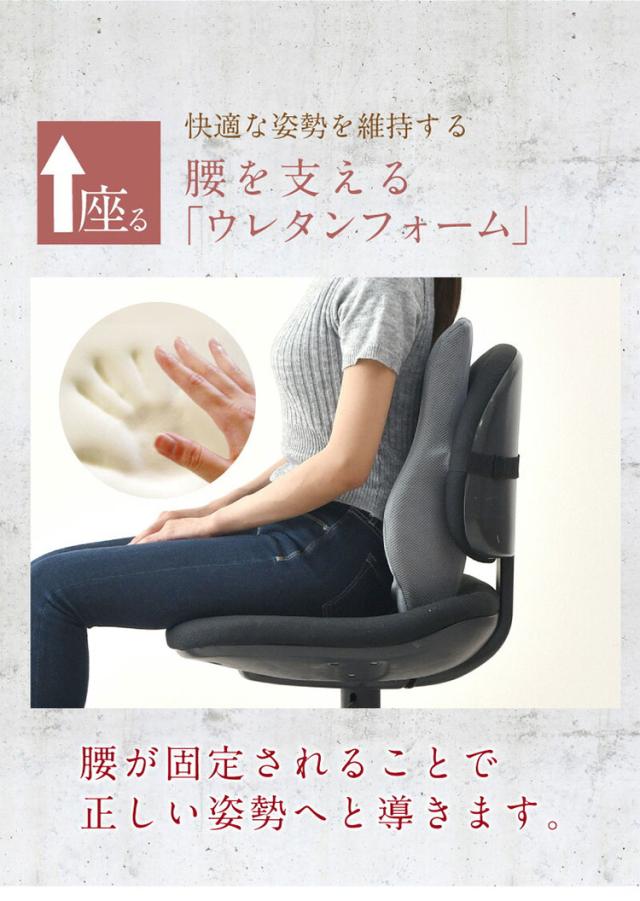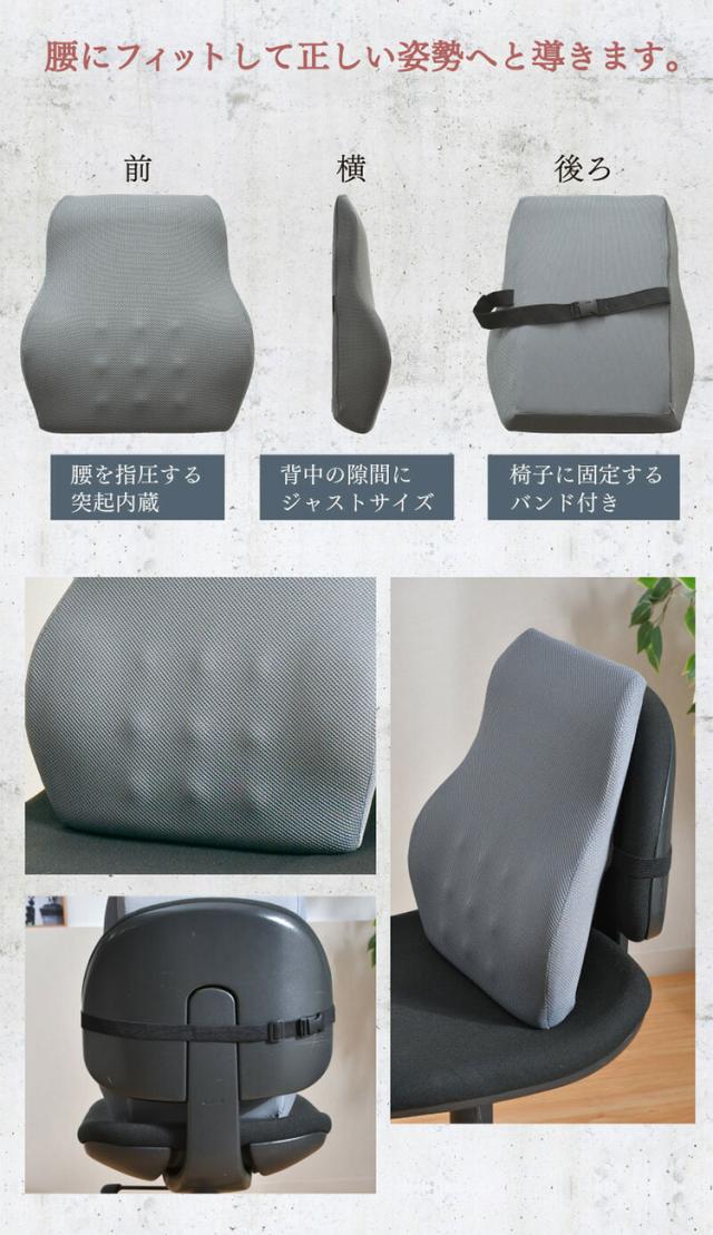 【腰をしっかり包み込む両サイド高め設計】【カーブ形状が腰にフィット】【腰を指圧する突起内蔵】【背中の隙間にジャストサイズ】【椅子に固定するバンド付き】