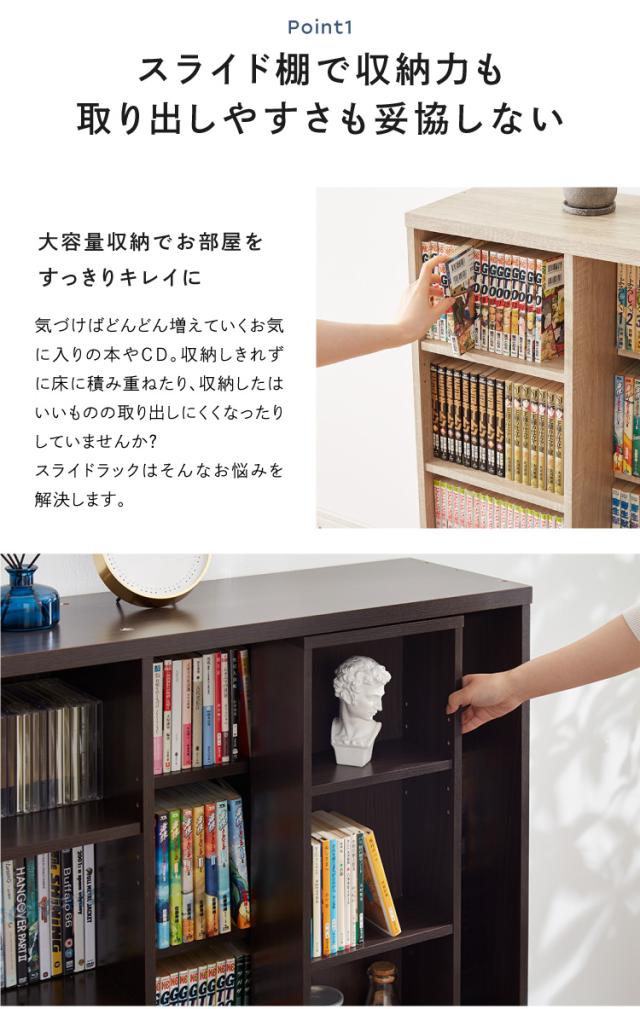 本体右側は左右にスライドできるスライド式棚を設置。スライド棚の後ろに右奥棚があり、スライド棚が左右に移動することで奥の本が一目でわかり出し入れが自由。
