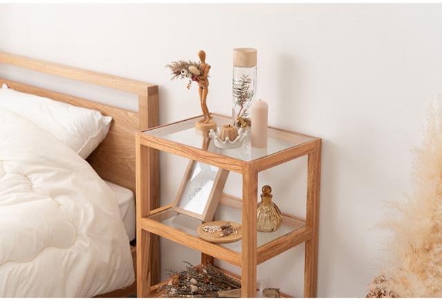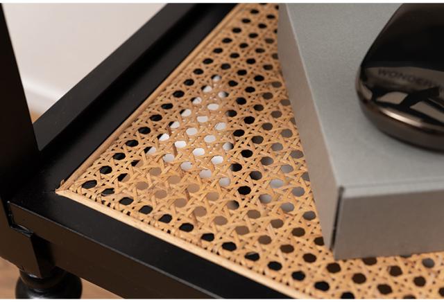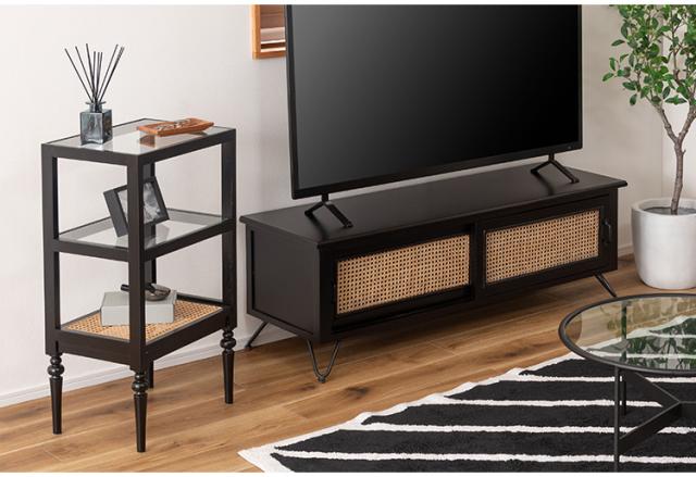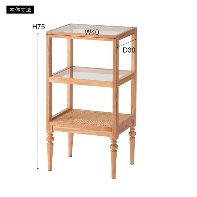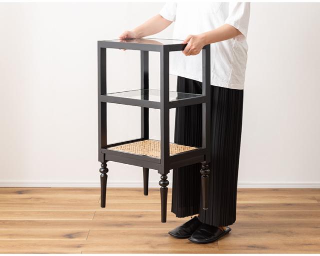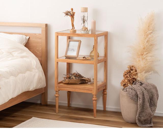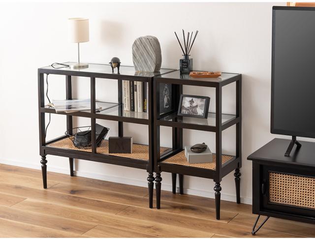 天然木とラタンを使用したナチュラルなイメージのデザインながら、ターンドレッグ(ろくろ脚)を採用することで、クラシカルな雰囲気も感じられるオープンシェルフ&サイドテーブル。ガラス天板で抜け感もあり、使いやすいサイズ感も魅力です。