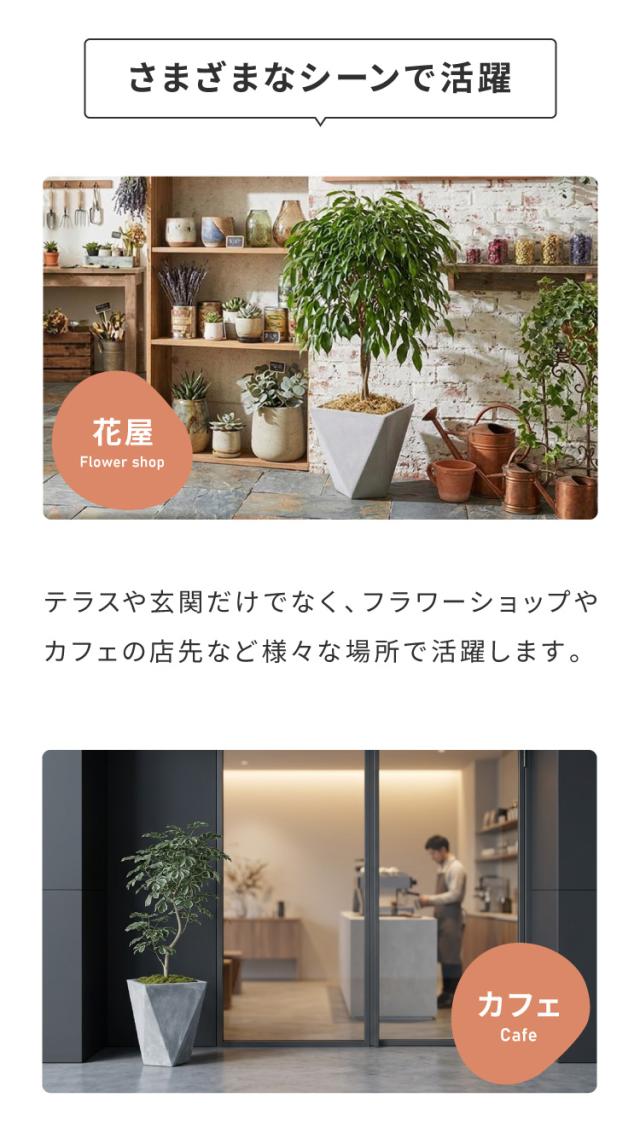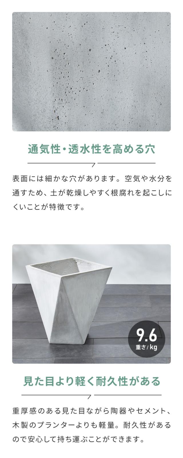 コンクリート調プランター、モダンデザイン、カフェ、花屋、什器、商業施設、オフィス、玄関、テラス、ベランダ、ガーデンインテリア、ガーデン雑貨、丈夫、鉢底穴、根腐れ防止、打ちっぱなし風
