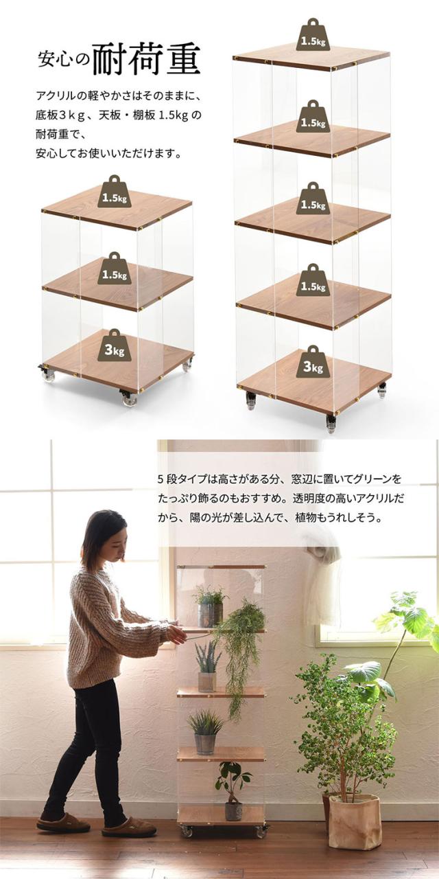 ■宙に浮いたような感覚ディスプレイ・本棚・ラックです。側板が透明のアクリル板なので突き抜け感が際立ち、部屋内のインテリアとしても、ゴテ付き感が無い、スッキリ感が前面に感じられるラックです。側板アクリルと棚板を止めるボルト頭も金色のキャップで見えなくなり、この金色がアクセントとして洒落ていますし、可愛さも醸し出しています。キャスターは透明の車輪を使用し、デザインの違和感を感じさせないです。趣味のコレクション・動物・車・ドールのミニチュヤ飾り棚ラックとして。写真・絵画・等のアート作品飾り棚。室内グリーン鉢。本棚・絵本棚として。お気に入りのハイブランドのバッグ等の装飾品の飾り棚としても。