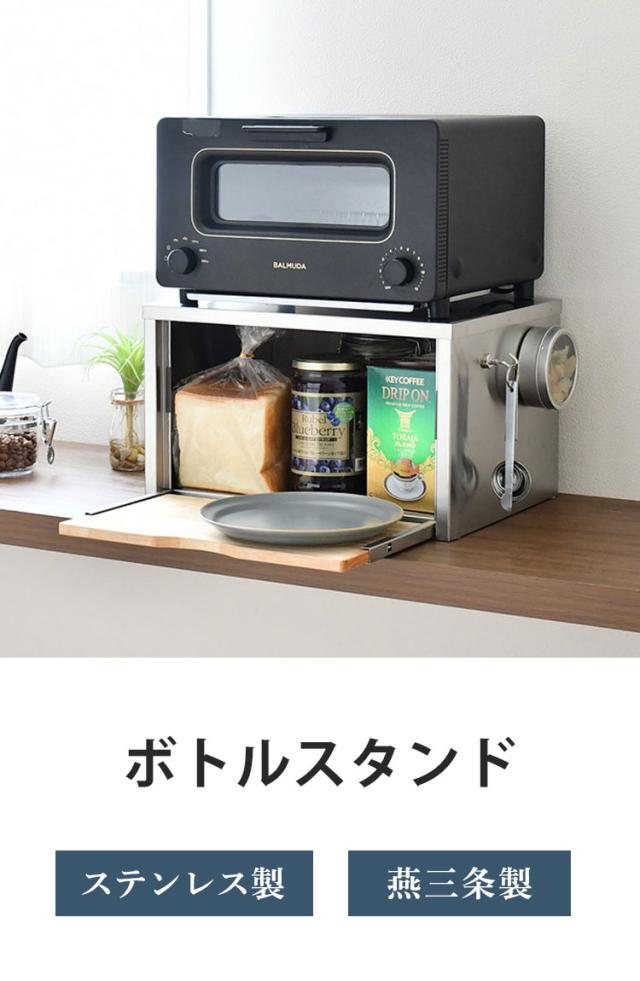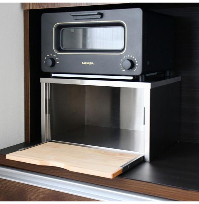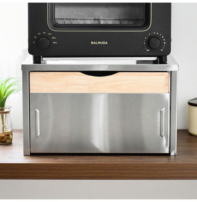 日本製 燕三条 ウッドとステンレスのブレッドケース 外せる木製トレー付き 頑丈 奥行28 トースターラック ブレッドケース 前開き 扉 キッチン収納 ブレッドボックス 食パン ジャム コーヒー 収納(代引不可)【送料無料】