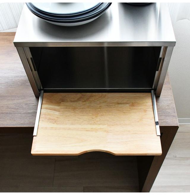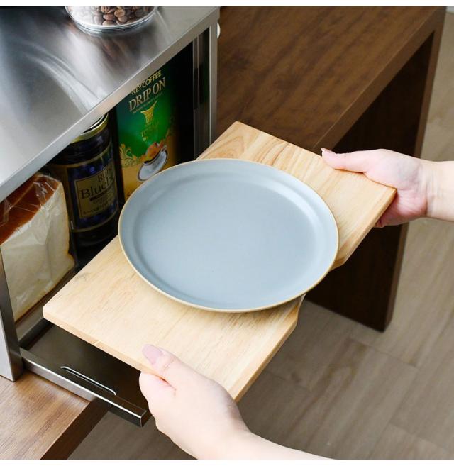 扉から見える木製板は簡易テーブルになるだけでなく、外してトレーとして使うこともできます。トレーは「食品衛生法 器具及び容器包装規格」に合格した塗料(オイル仕上げ)を使用しているため、トレーに直接食品を置いても大丈夫です。