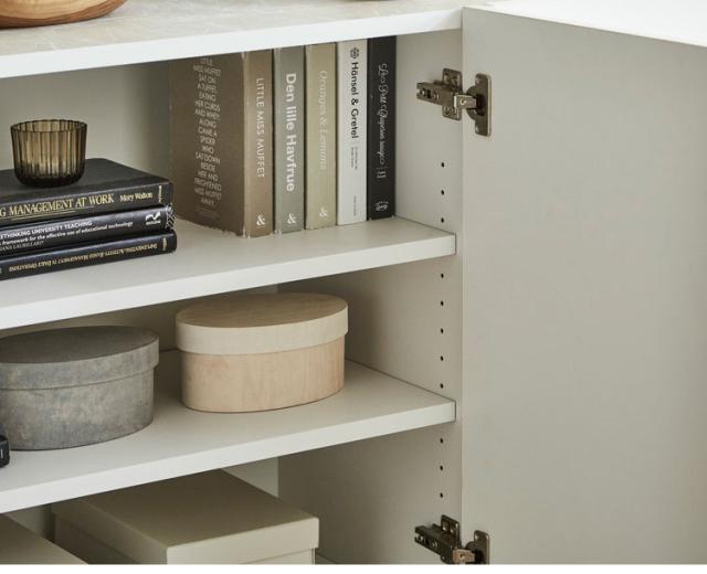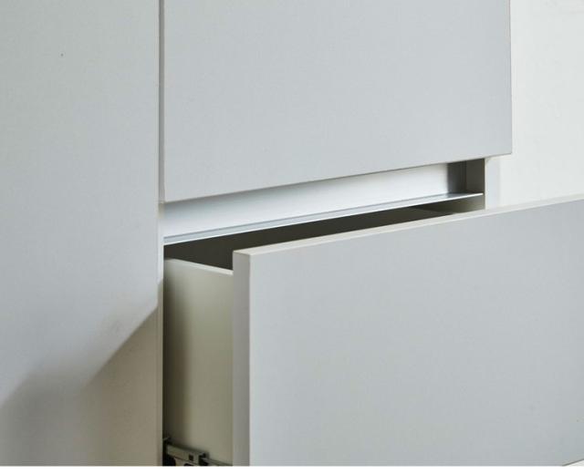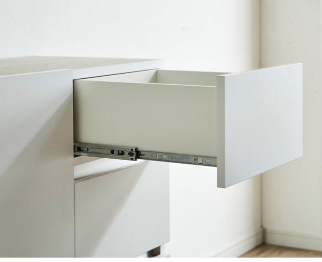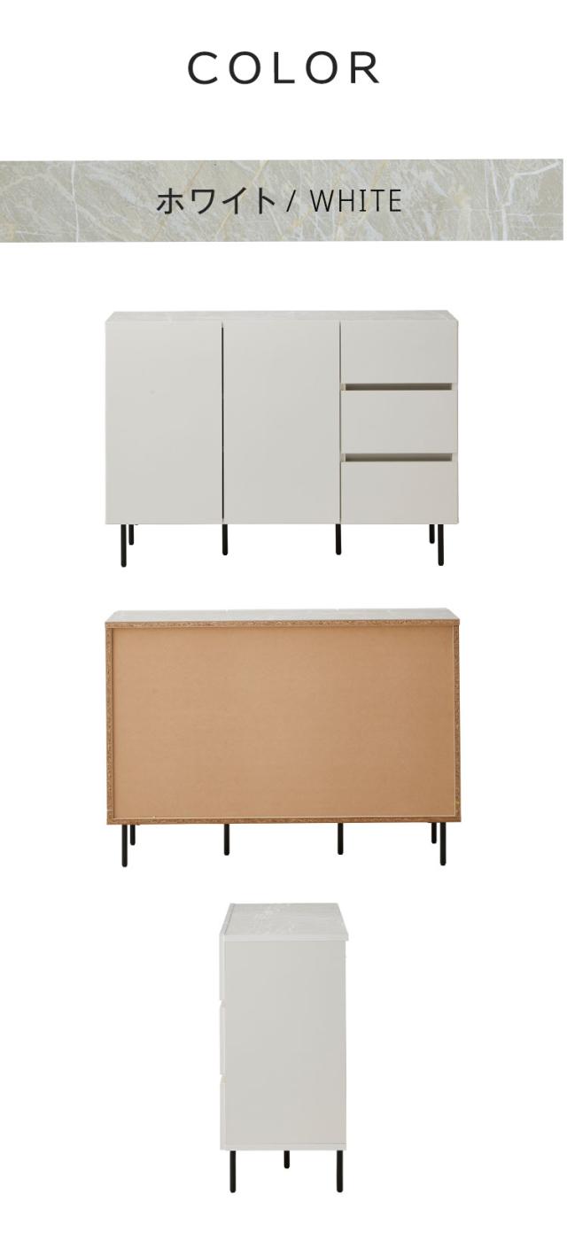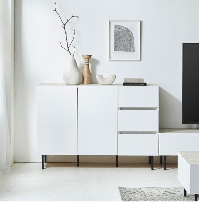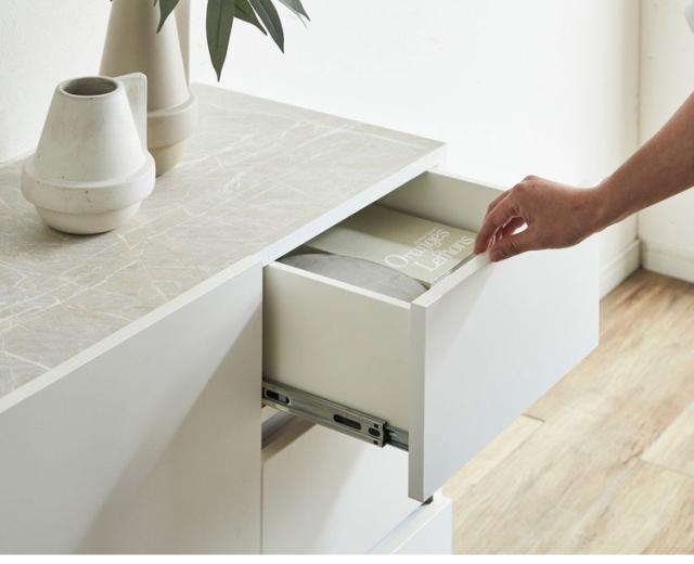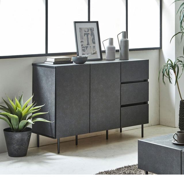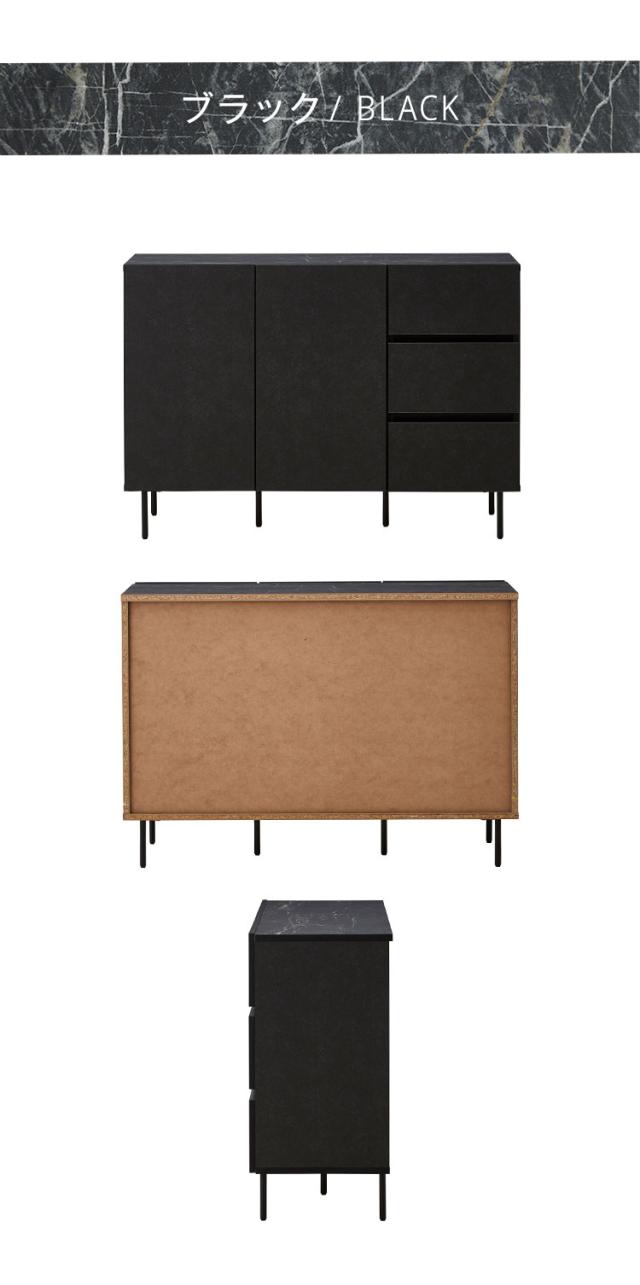 シックなデザインの120cm幅サイドボードです。大容量の収納力が魅力の商品です。空間を演出するシックなデザインとして石目調のブラックとホワイトを採用。品のあるデザインとなっております。引き出しにはフルオープンのスライドレールを採用しているので、最後まで引き出して使用することが可能です。可動棚板は2枚ついており3cmピッチで14穴ございます。扉はソフトクローズ仕様で大きな音を立てることなく閉めることが出来ます。120cmという幅がお部屋に圧迫感を与えず程よいサイズ感となっております。