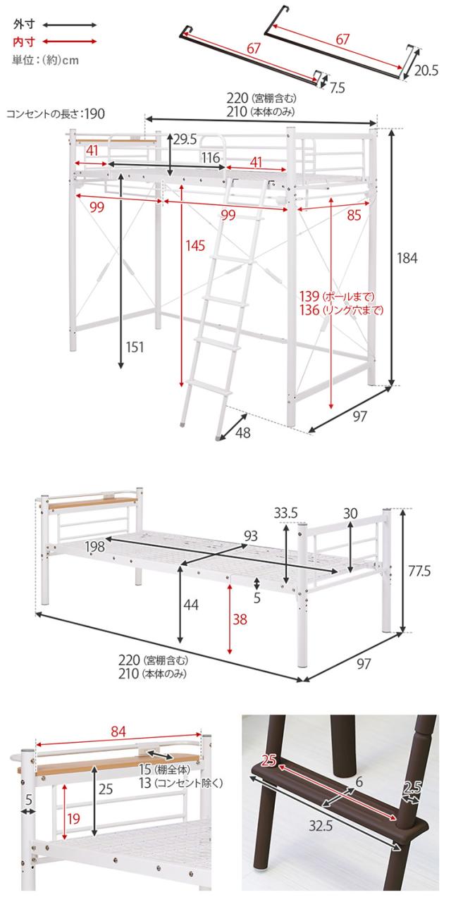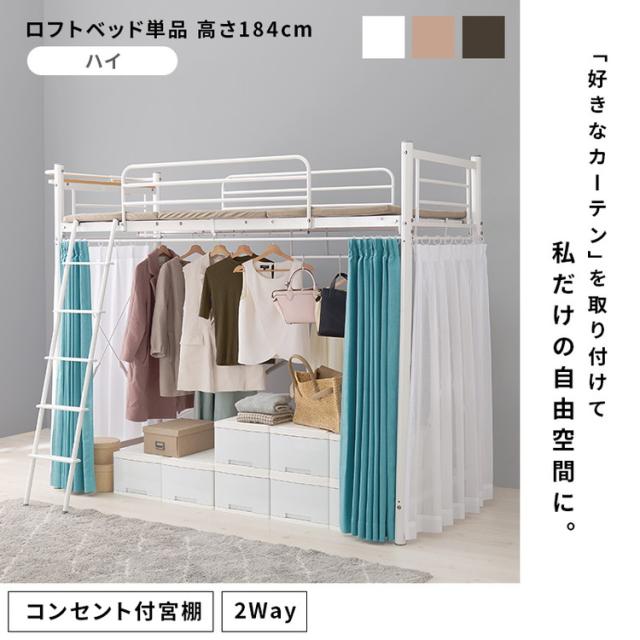 ロフトベッド 高さ184cm 棚コンセント付き シングル ハイタイプ 耐荷重100kg システムベッド 収納 ハンガー パイプベッド 宮棚付き ベッドフレーム はしご 一人暮らし(代引不可)【送料無料】