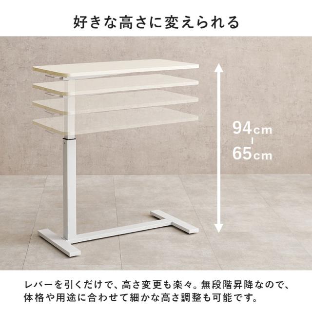 ガス圧式で無段階に高さ調節ができる昇降テーブル。キャスター付きで移動がしやすく、ソファやベッドに座って作業するときも脚が邪魔にならないデザインです。