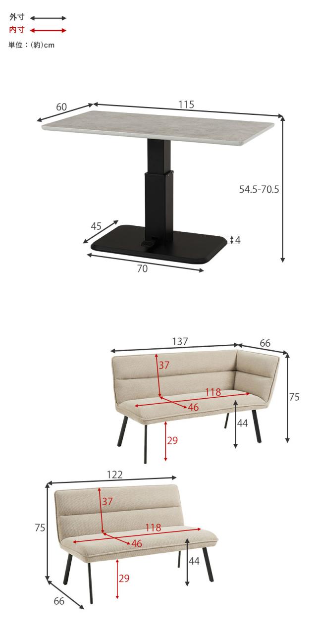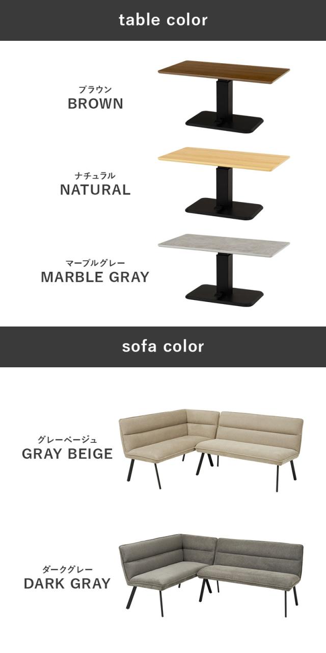 ソファ2点セット 左肘タイプ | ソファ2点セット 右肘タイプ | 昇降テーブル 115×60cm | 昇降式 サイドテーブル 80×40cm |