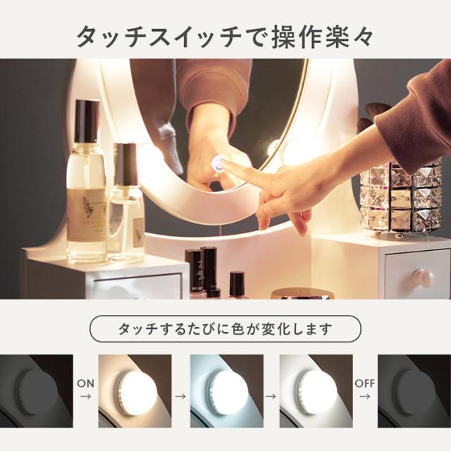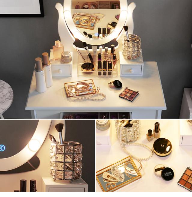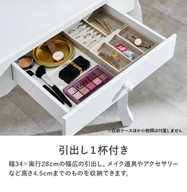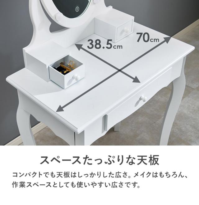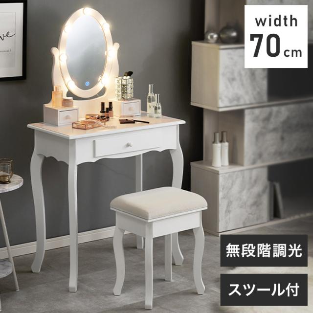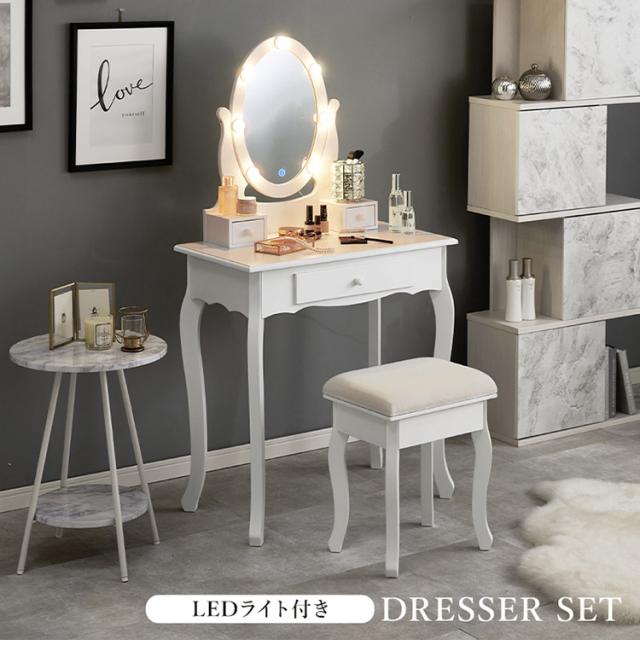 LEDの女優ライト付きドレッサーでロマンティックな雰囲気を堪能できます。上品な曲線脚のデザインを合わせたスツール付き