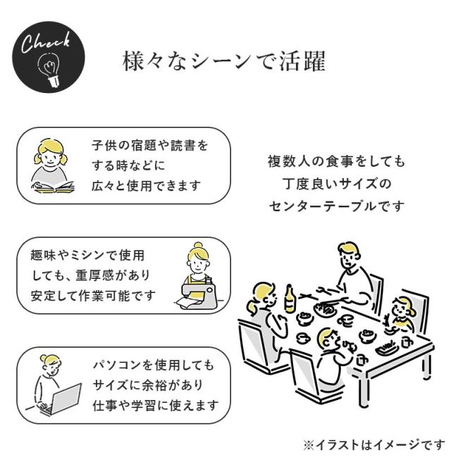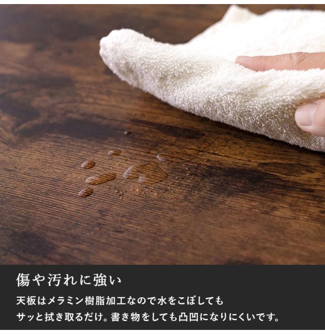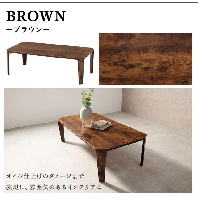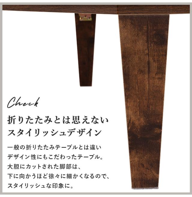 お部屋にヴィンテージな雰囲気を演出する古木調のテーブル。広々使うことができ、脚を折りたたんで隙間に収納も可能