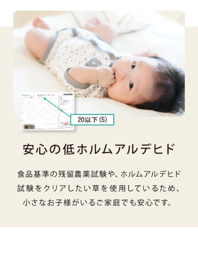 食品基準の残留農薬試験やホルムアルデヒド試験をクリアしたい草を使用しているため小さなお子様がいるご家庭でも安心。