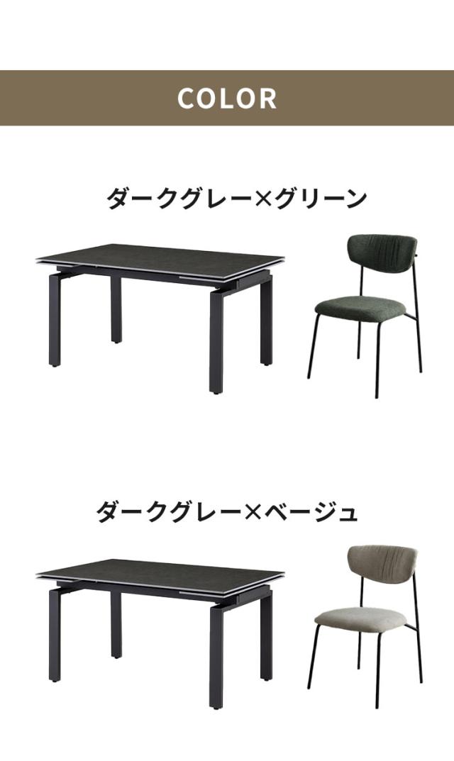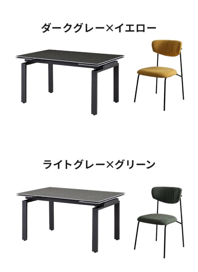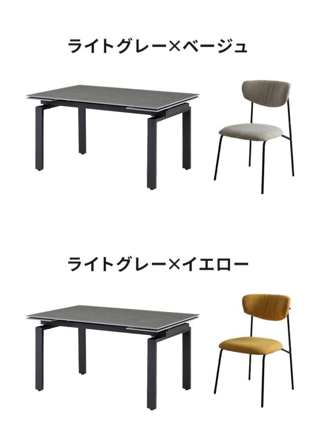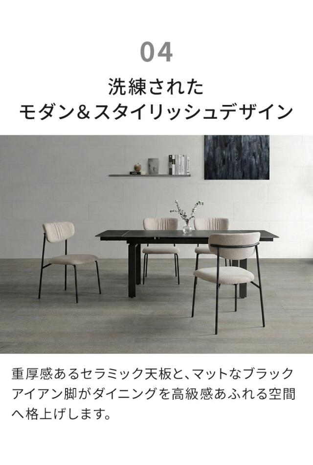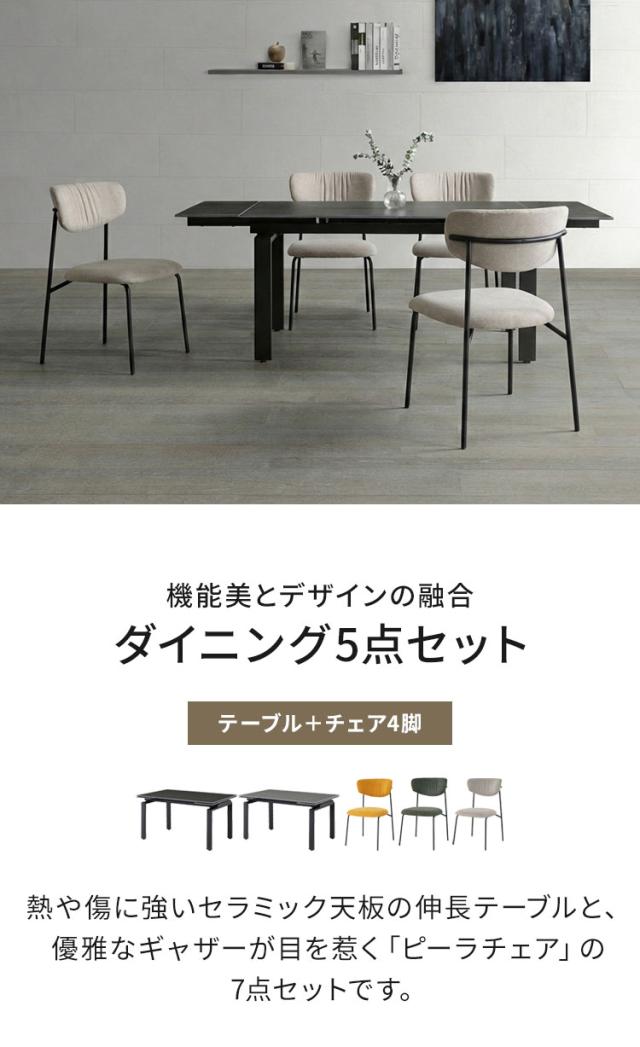 熱や傷に強い「セラミック天板」の伸長テーブルと、優雅なギャザーが目を惹く「ピーラチェア」の5点セットです。