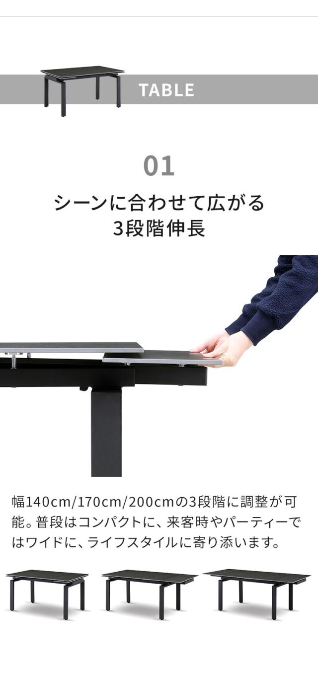 3段階伸長(140/170/200cm): スライドするだけで、来客時も広々使える最大200cmへ拡張。