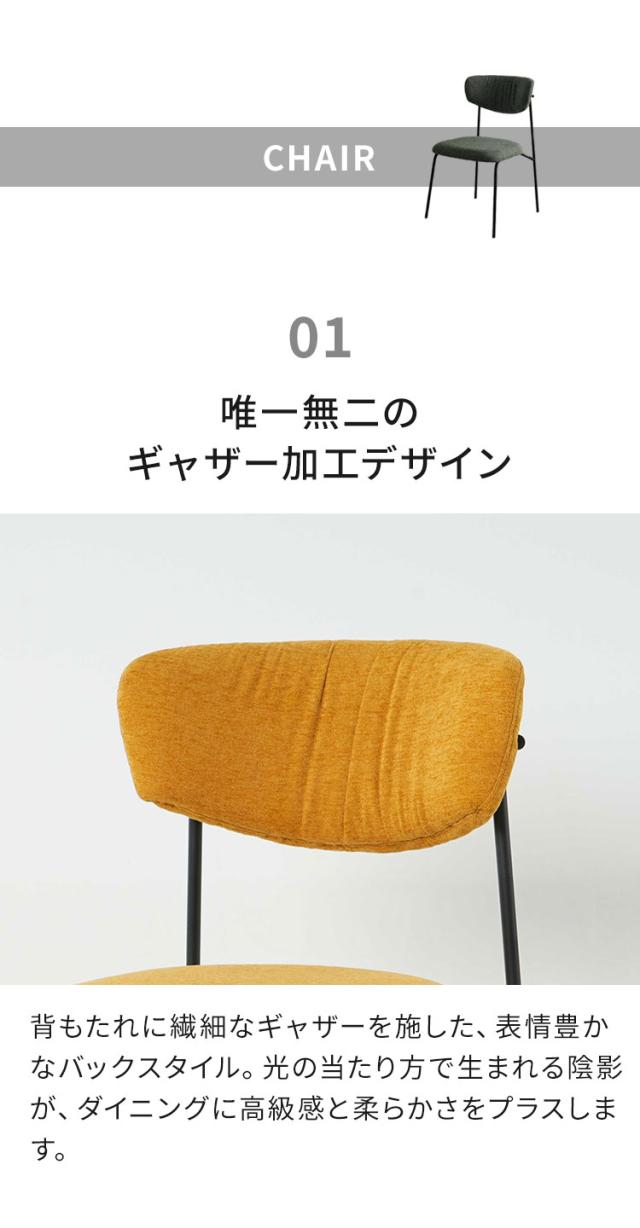 洗練されたギャザー加工: 背もたれの繊細な表情が、ダイニングに高級感と優しさをプラス。