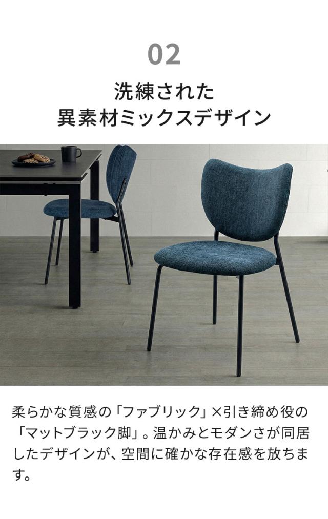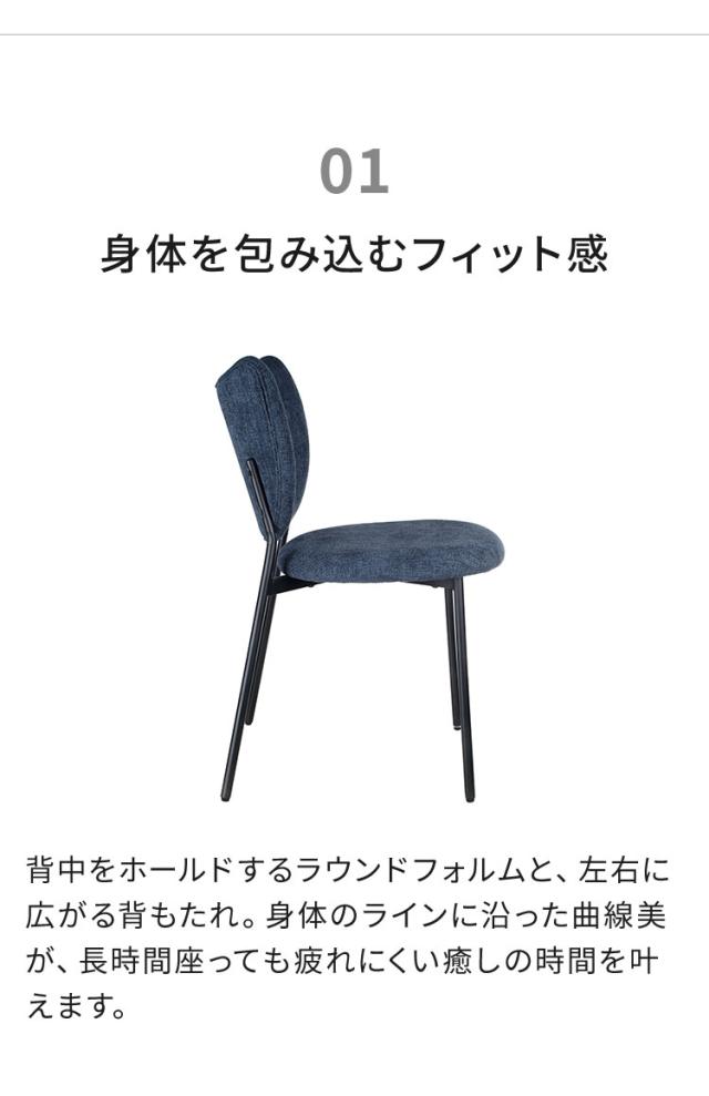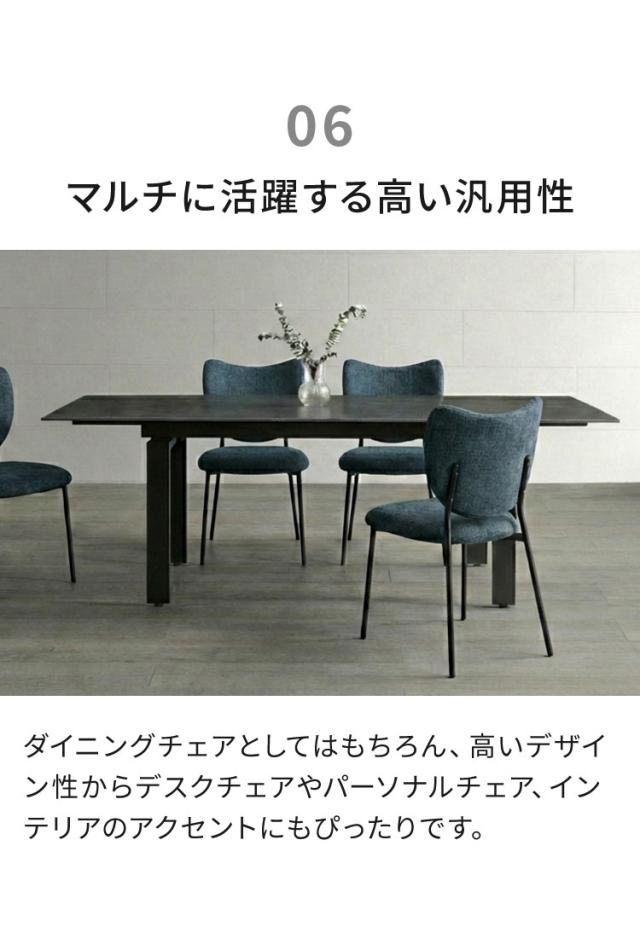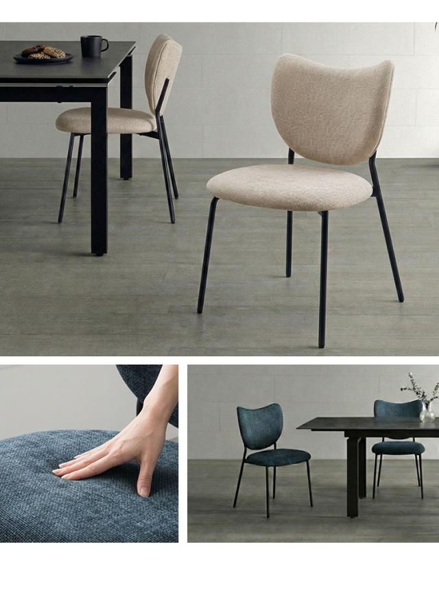 ファブリックの柔らかな質感と、それを引き締めるアイアン脚のコントラストが、洗練されたダイニング空間を演出します。