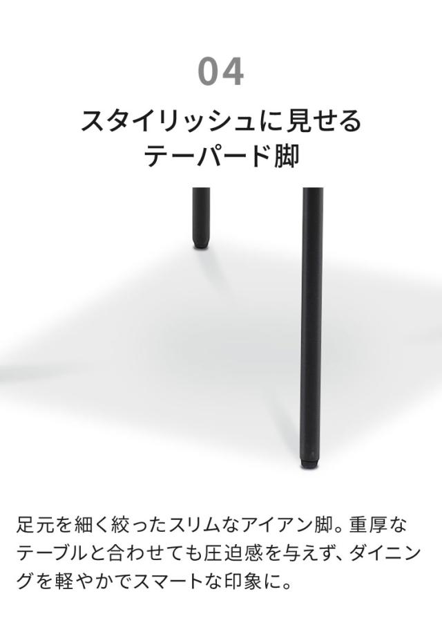 温かみのある布地に対し、脚部にはマットブラックのアイアンを使用。足元を細く絞ったデザインにすることで、重厚すぎず、スタイリッシュで軽やかな印象を与えます。