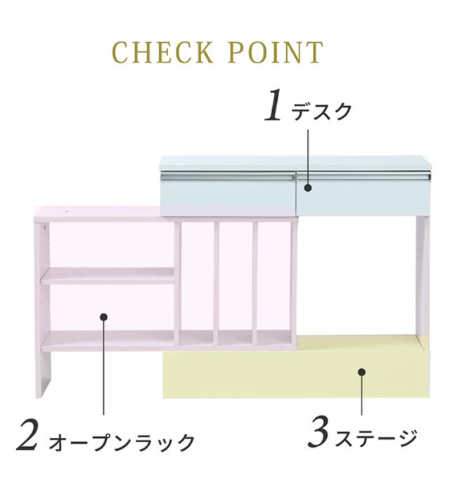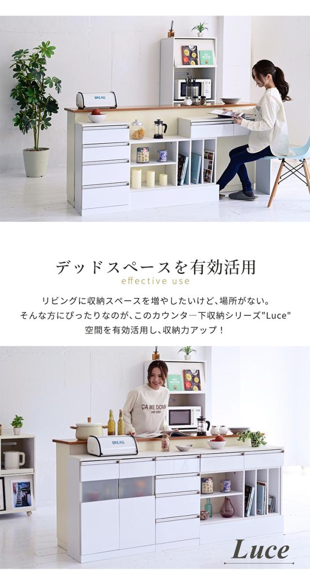 カウンター下のデッドスペースを有効活用できる収納シリーズ“Luce”。用途やスペースに合わせて自由に伸縮できる、ラックとしても使えるデスクです。真ん中のオープンラックを反転すればレイアウトの変更もできます。
