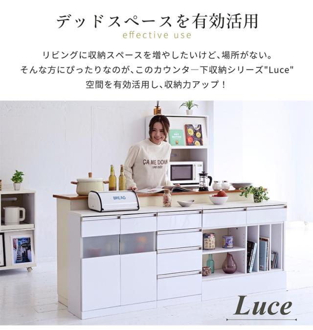 カウンター下のデッドスペースを有効活用できる収納シリーズ“Luce”。鏡面仕上げで高級感をプラスするシンプルな4段チェスト。キッチン、ダイニング周りのこまごましたものを収納するのにぴったりです。
