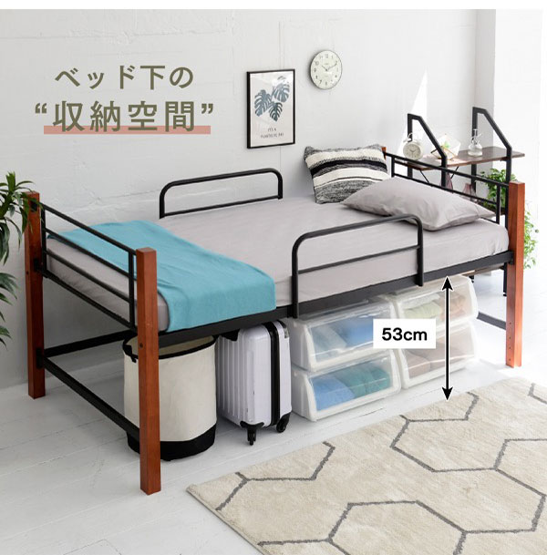 天然木の支柱がおしゃれなパイプベッド。高さはミドルタイプなので、ベッドの下には収納スペースがあり、プラスティックケースなどが入れられます。