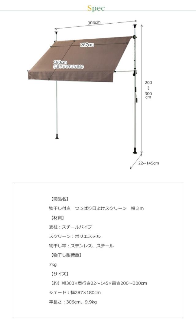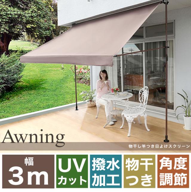 日よけ 竿付オーニング2 幅3m シェード オーニング 日よけスクリーン つっぱり式 雨よけ ガーデニング エクステリア(代引不可)【送料無料