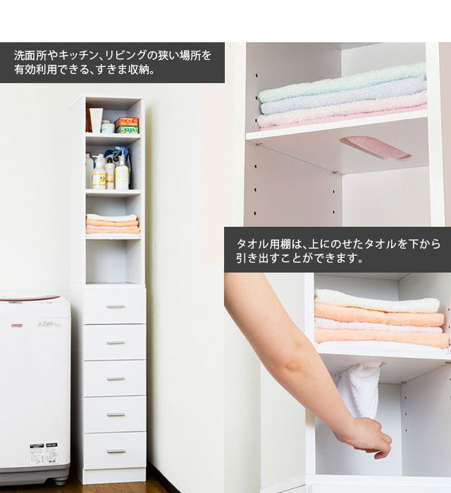 洗面所やキッチン、リビングの狭い場所を有効利用できるすきま収納。