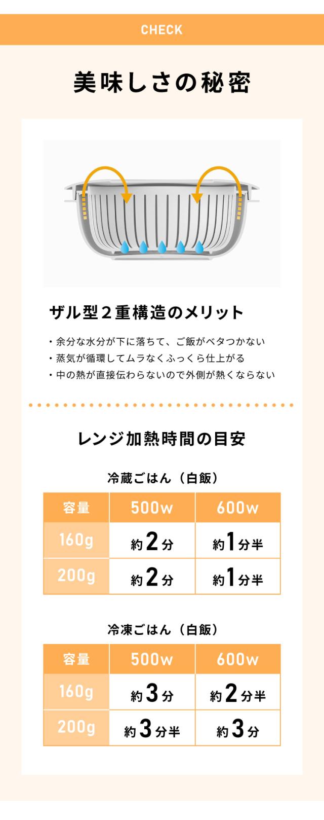 【冷凍ごはん】(白飯160g)500W 約3分/600W 約2分30秒 (白飯200g)500W 約3分30秒/600W 約3分