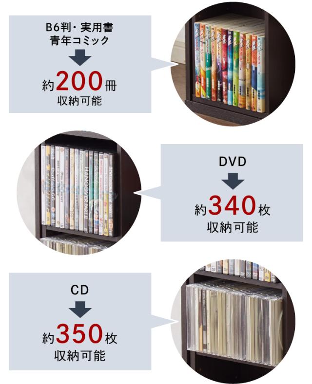 スライド棚の可動棚を調整してDVDを収納可能です。