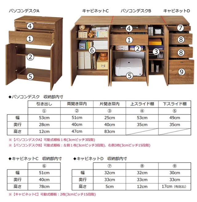 パソコンデスクA 60幅 | パソコンデスクB 90幅 | キャビネットC 扉収納 60幅 | キャビネットD チェスト 40幅 |