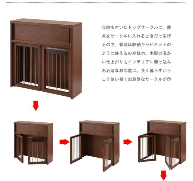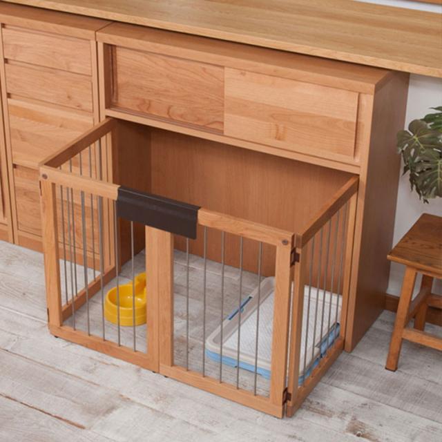 手をかけやすく、すっきりとした掘り込みの取っ手は天然木ならではの加工。愛犬をサークルに入れるときだけ広げるので、普段は収納キャビネットのように使えるのが魅力。