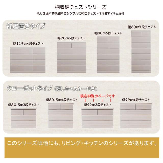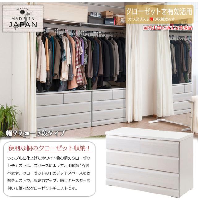 日本製 クローゼットチェスト 幅99 3段 ホワイト チェスト 三段 クローゼット 収納 幅99cm 99cm幅 完成品 キャスター付き 北欧 木製 シンプル 天然木 桐 衣類収納 白 国産(代引不可)【送料無料】