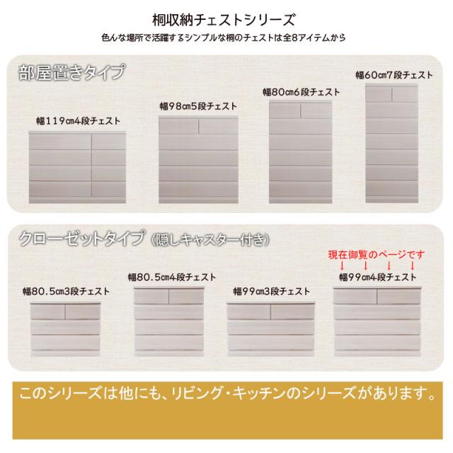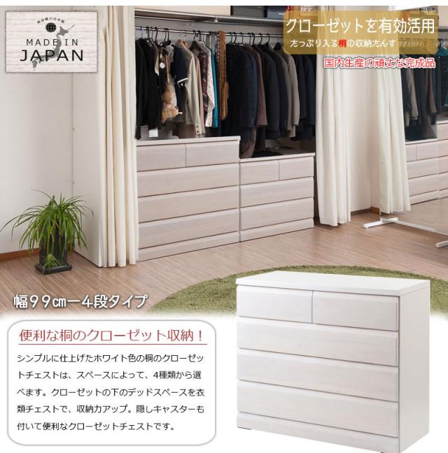 日本製 クローゼットチェスト 幅99 4段 ホワイト チェスト 四段 クローゼット 収納 幅99cm 99cm幅 完成品 キャスター付き 北欧 木製 シンプル 天然木 桐 衣類収納 白 国産(代引不可)【送料無料】