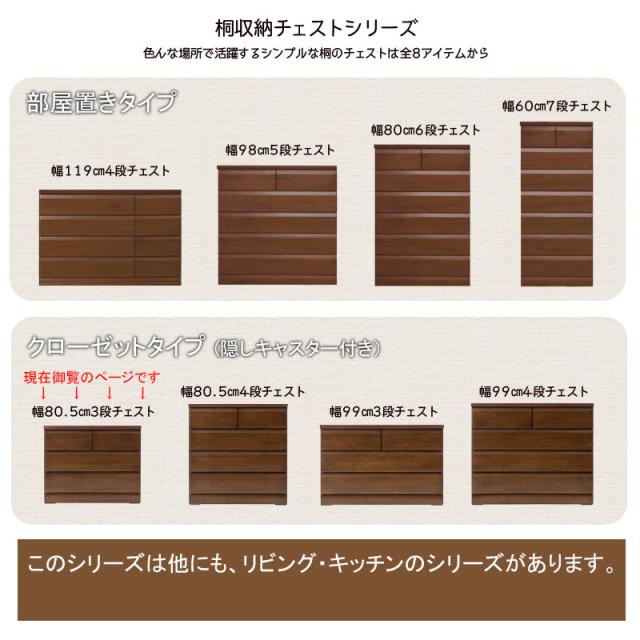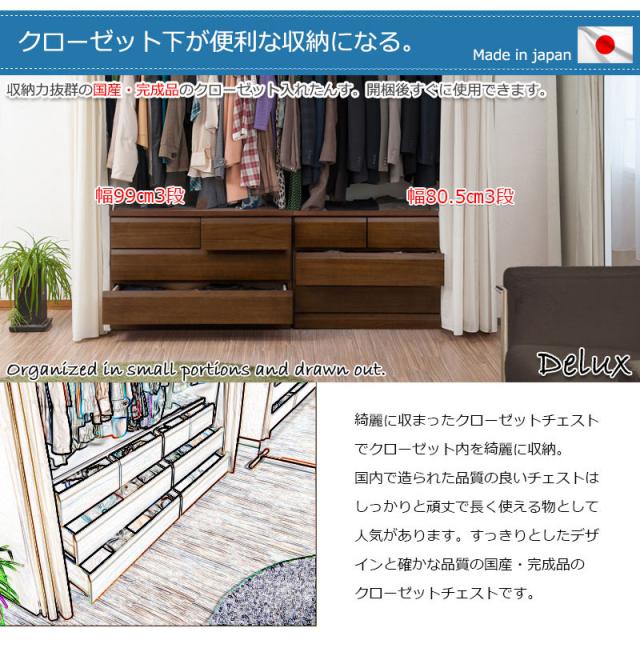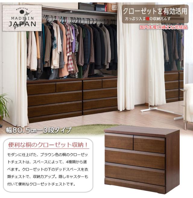 日本製 国産 クローゼットチェスト 幅80.5 3段 ダークブラウン チェスト 三段 クローゼット 収納 幅80.5cm 80.5cm幅 完成品 キャスター付き 北欧 木製 シンプル 天然木 桐 衣類収納 茶(代引不可)【送料無料】