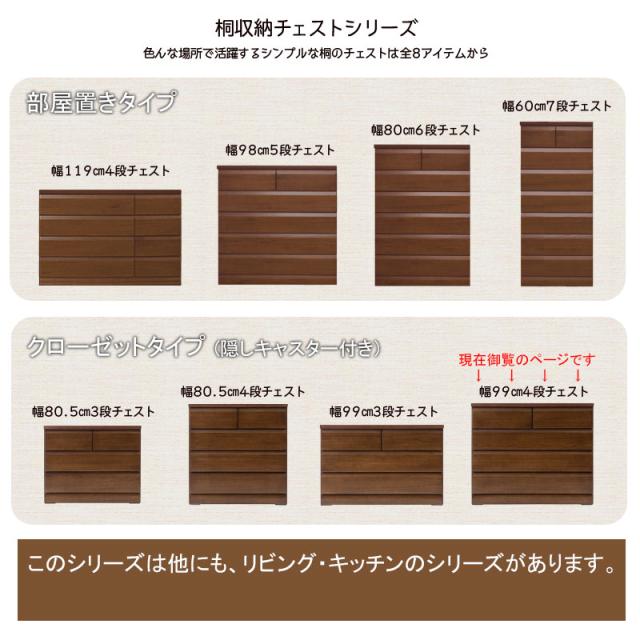 日本製 国産 クローゼットチェスト 幅99 4段 ダークブラウン チェスト 四段 クローゼット 収納 幅99cm 99cm幅 完成品 キャスター付き 北欧 木製 シンプル 天然木 桐 衣類収納 茶(代引不可)【送料無料】